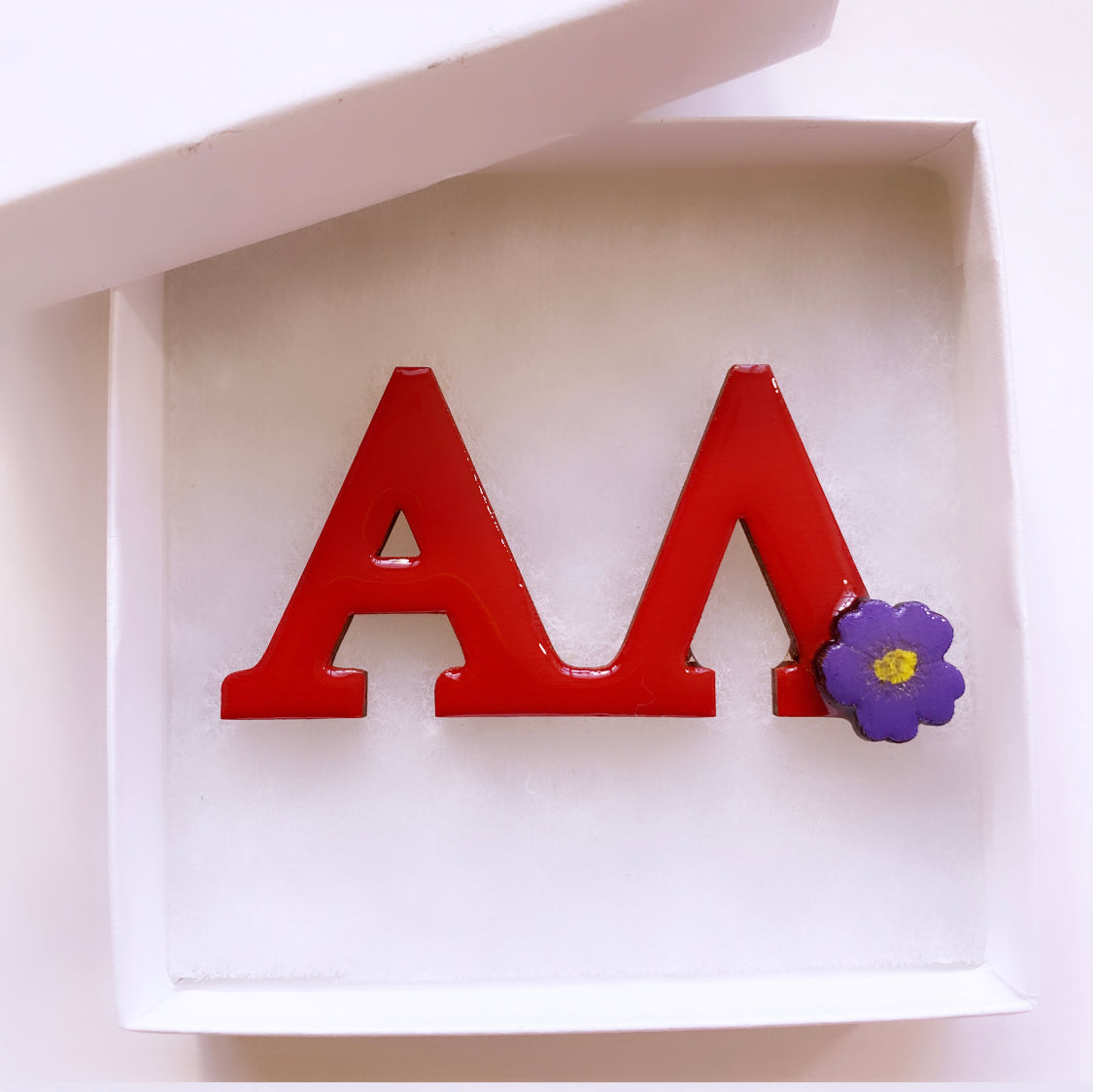 Another original and best-selling Chic Greek Chapter Brooch. This beautiful Brooch will add all the glam that you'll need to accessorize your outfit.  The handcrafted pin has is created for members of Delta Sigma Theta Sorority, Inc.  African Violet flower design topped with customizable chapter Greek letters.  Each brooch is hand painted and bedazzled with love.
